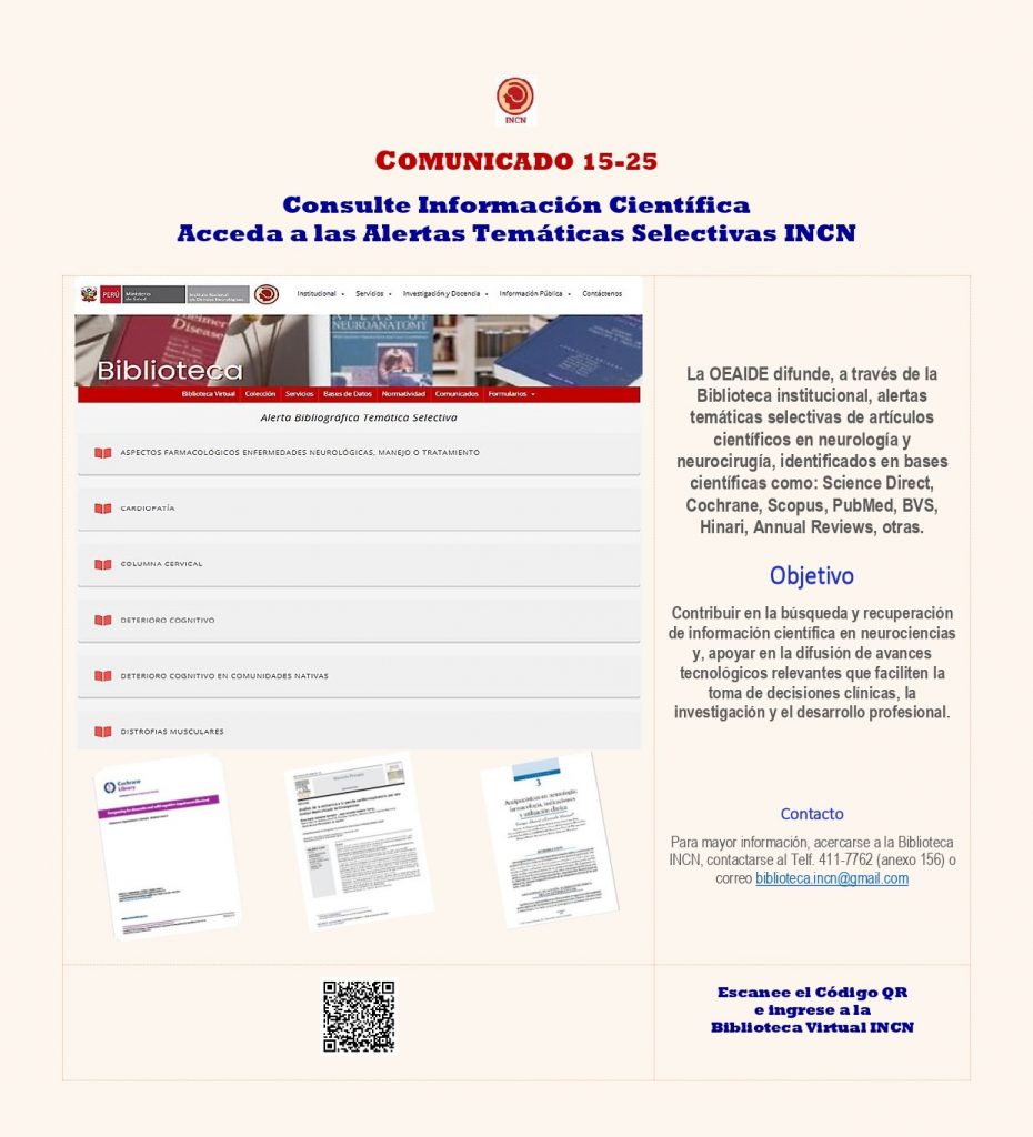 Los invitamos a acceder a las Alertas Temáticas Selectivas de la Biblioteca INCN, las cuales contienen artículos actualizados y relevantes en el campo de las Neurociencias.
