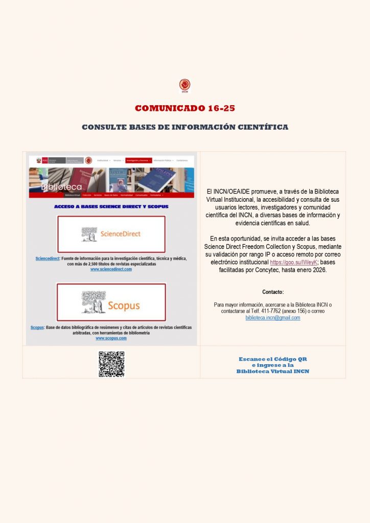 La Biblioteca del INCN invita acceder a las bases de información y evidencia científica, facilitadas por Concytec: “Science Direct” y “Scopus”, en apoyo a los usuarios investigadores, residentes, pregrado y comunidad interesada. Puede ingresar a través del IP institucional a: