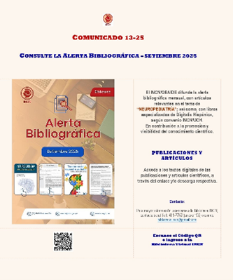 La Biblioteca del INCN invita acceder a la Alerta Bibliográfica de setiembre 2025, con artículos relevantes en el tema de “Neuropediatría”; así como, con títulos de libros electrónicos multidisciplinarios de Digitalia Hispánica (Convenio interinstitucional INCN/UCH).