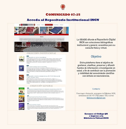 La Biblioteca del INCN invita a consultar el nuevo Repositorio INCN, el cual reúne colecciones institucionales y generales de ingreso periódico, disponibles tanto en formato impreso como digital.