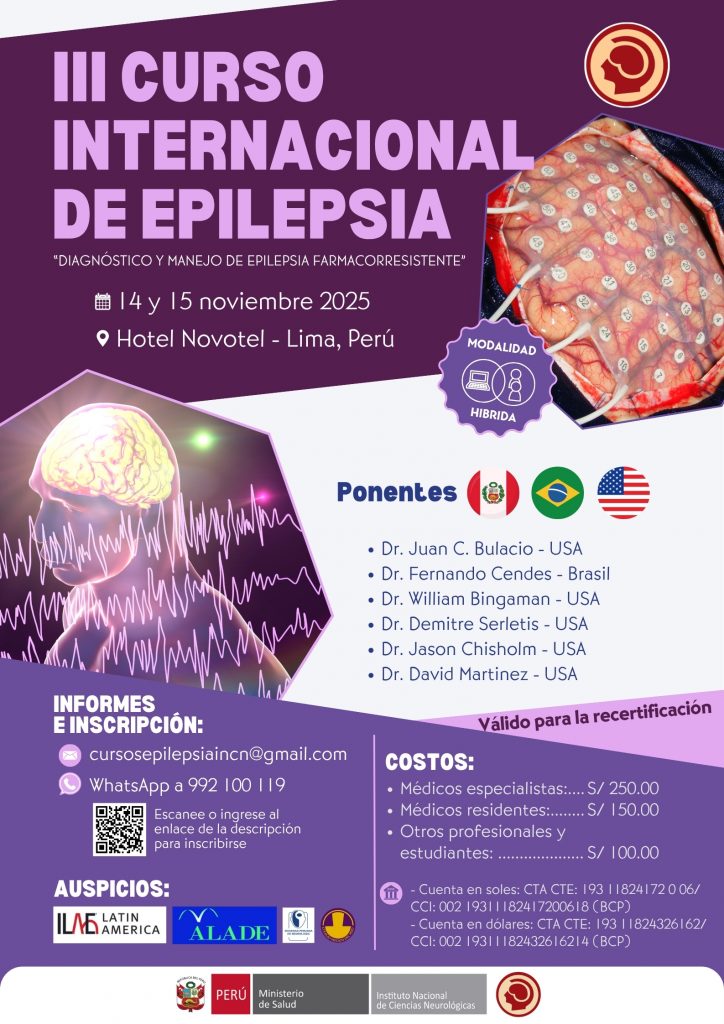 El Instituto Nacional de Ciencias Neurológicas (INCN), a través del Departamento de Epilepsia, tiene el agrado de presentar el III Curso Internacional de Epilepsia: “Diagnóstico y Manejo de Epilepsia Farmacorresistente”, encuentro académico que reúne a destacados especialistas nacionales e internacionales con el propósito de actualizar y fortalecer los conocimientos en el Diagnóstico y Manejo de la Epilepsia Farmacorresistente.